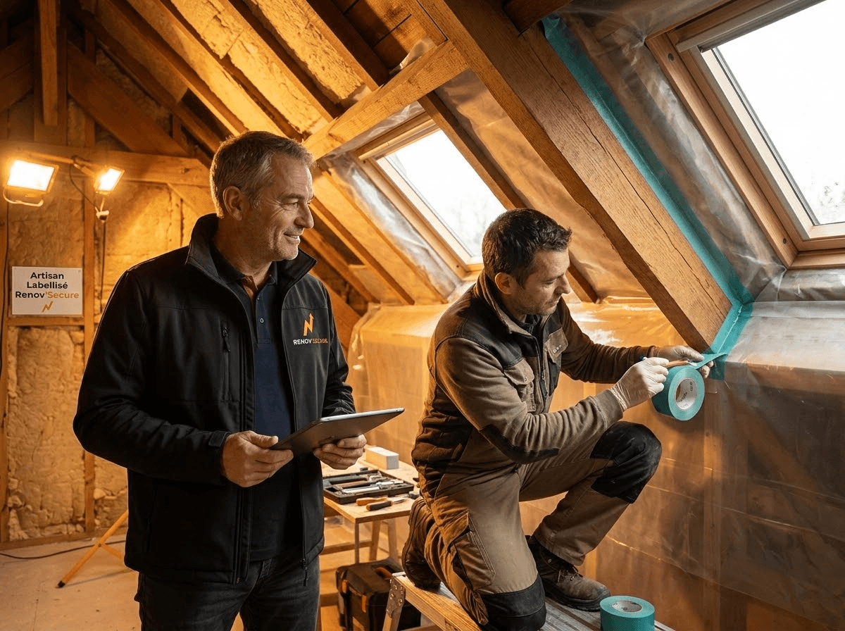 La pose du pare-vapeur est cruciale. Nos équipes appliquent une méthode de pose chirurgicale pour bloquer l'humidité et protéger la structure de votre toiture sur le long terme.